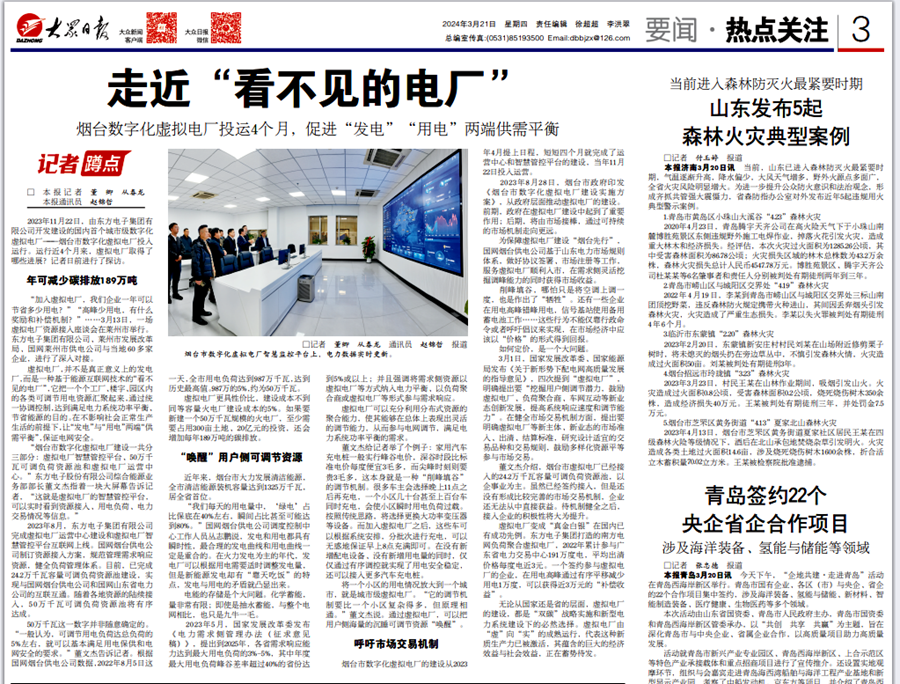 为保障虚拟电厂建设“烟台先行”,国网烟台供电公司基于山东电力市场规则体系,做好协议签署、市场注册等工作,服务虚拟电厂顺利入市,在需求侧灵活挖掘调峰能力的同时获得市场收益。